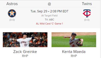 단기전에서는 선발투수만큼 중요한 것이 없다. 선발이 무너지면 그 경기는 그냥 내 주어야 하기 때문이다. 오늘의 첫 경기 선발매치업은 AL중부로 옮기면서 슈퍼에이스가 된 마에다와 명예의전당이 유력한 백전노장 야구천재 그레인키의 대결이다.