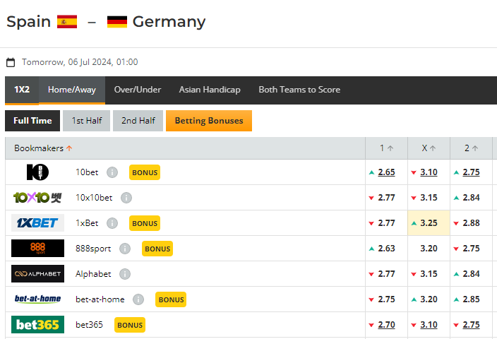 배당률 역시 업체마다 다른 견해를 보일 정도로 팽팽하다. 독일에서 열리는 경기임을 고려하면 스페인에 근소한 우위라고 할 수 있지만, 토너먼트 특성상 그러한 어드밴티지는 크지 않다.