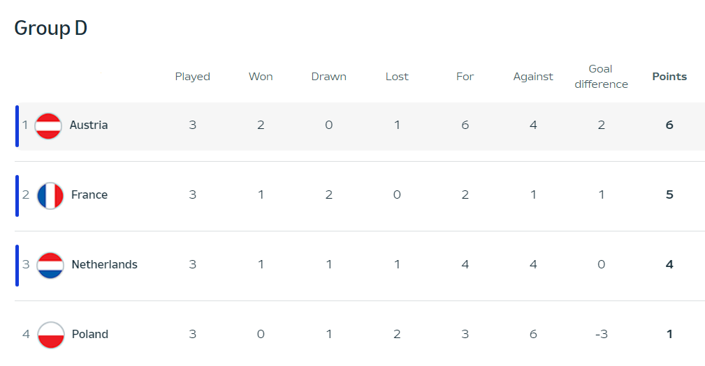 네덜란드는 D조 3위로 합류했다. 프랑스와 무승부를 했지만 오스트리아에게 패한 것이 문제, 결과적으로 폴란드를 잡은 첫 게임이 도움이 되었다. 공수 모두 안정적이지 못했고 실점을 많이 했다는 것이 특징이라면 특징이 될 것이다. 다만, 토너먼트에 올라간 이후에 있어서 조금 더 잠재적인 스쿼드를 갖췄다는 것은 긍정적으로 볼 수 있는 대목이다.