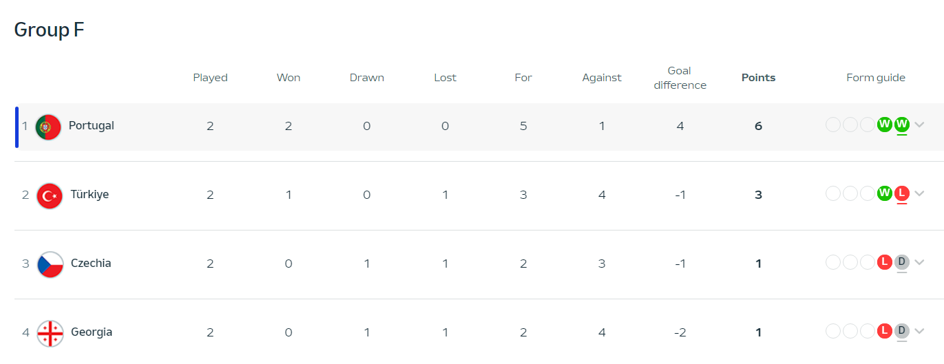 포르투갈이 조1위를 확정지은 가운데 (터키와 체코를 모두 이김), 체코는 탈락 위기에 놓여 있다. 체코가 조지아 상대로 무승부를 기록했기 때문인데, 한편으로는 마지막 극장골을 먹혔다면 정말 재미있었을 듯 하다.