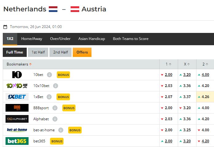 이 경기의 배당률이다. 이름값이나 랭킹 등에 따라 네덜란드의 정배가 주어졌지만, 압도적인 배당률은 아니다. 프랑스가 오스트리아 상대로 받은 배당보다 훨씬 높기 때문이다. 오즈메이커들도 예측이 어려운 듯 하다.