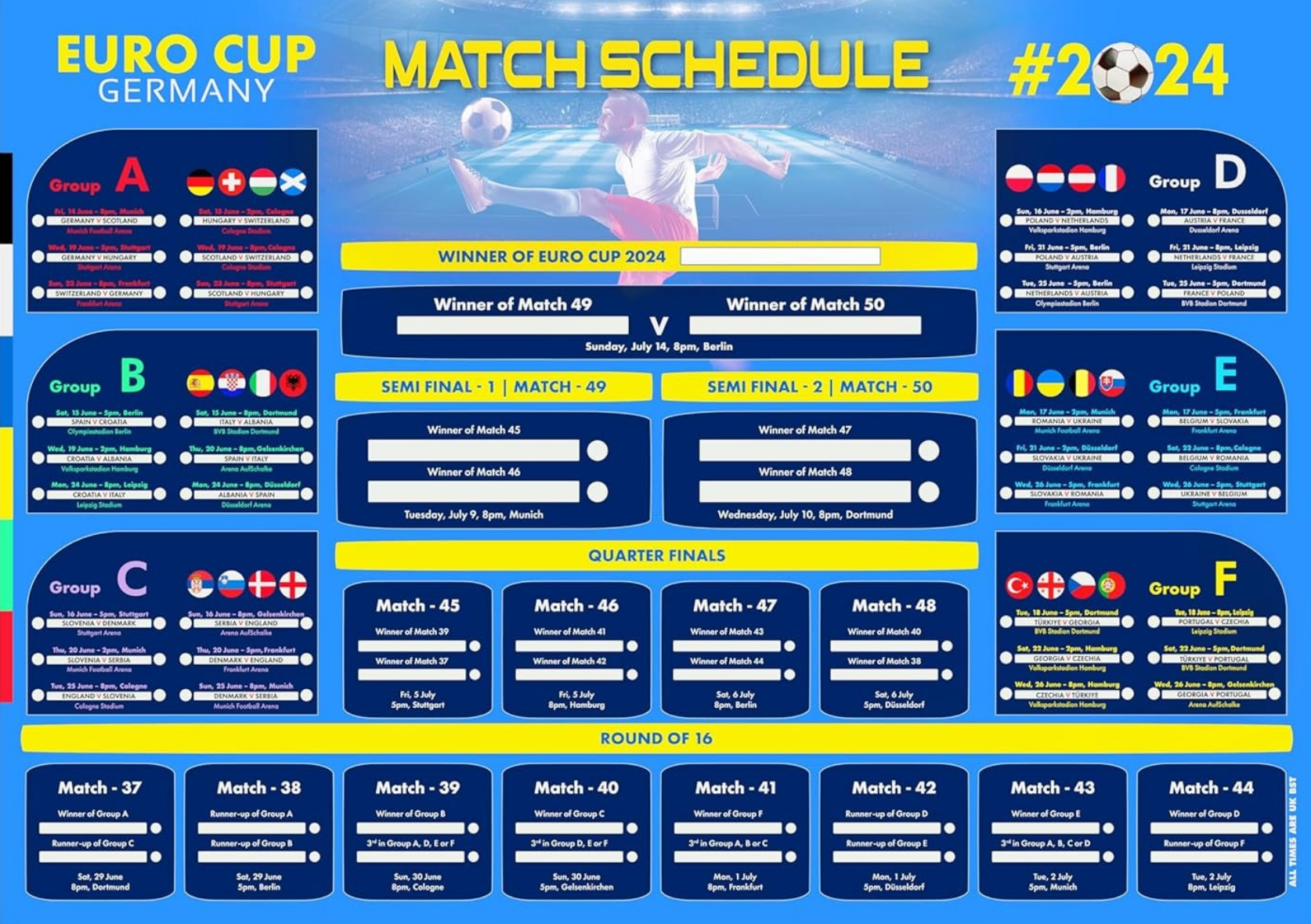 A조1위는 C조2위와 경기를 치르며, A조 2위는 B조 2위와 경기를 치른다. B조 2위는 이탈리아, 크로아티아 중에 한 팀이 될 것으로 보이며 C조는 잉글랜드가 1위를 할 경우 대진이 수월해지는 것은 사실이다.