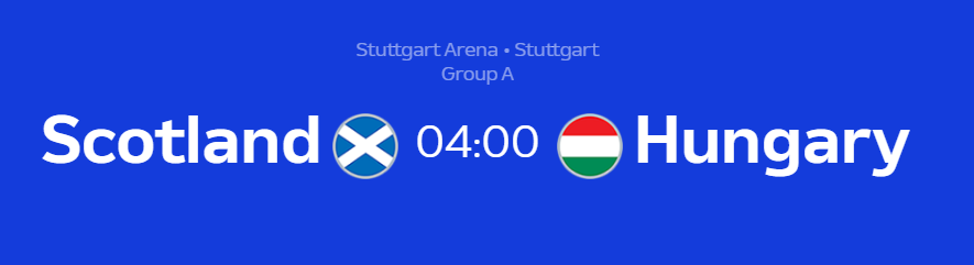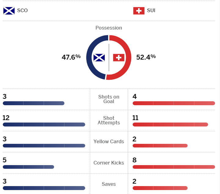 스코틀랜드는 독일에게 1-5 로 패했으나 스위스전에서 비교적 선전했다. 특히 경합과정에서 스위스를 압도했으며 이 점이 인상적이었다. 스탯으로 보는 축구에서도 밀리지 않은 느낌, 결국 1-1 무승부로 종료되었고 스위스는 1승1무로 독일에게 지더라도 16강 진출이 유력해졌고 스코틀랜드는 헝가리를 잡을 경우 16강 진출의 가능성이 높아진다.