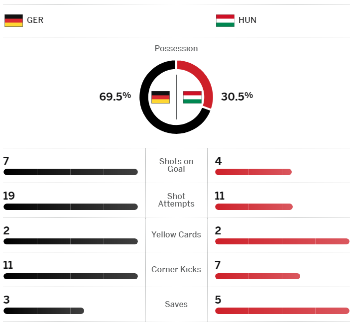 헝가리는 독일에게 0-2 로 패했는데, 첫번째 골이 홈 어드밴티지로 반칙이 아닌 골 선언이 되어버리면서 말려들었고 아쉬운 경기였다. 생각보다 스탯을 봐도 큰 차이가 나지 않는 수준의 경기를 펼쳤다. 독일이 공격을 더 많이 가져간 것은 맞지만 개최국 버프 등을 고려할 때 엄청난 선전이었다. 다음 경기가 기대되는 수준이었다.