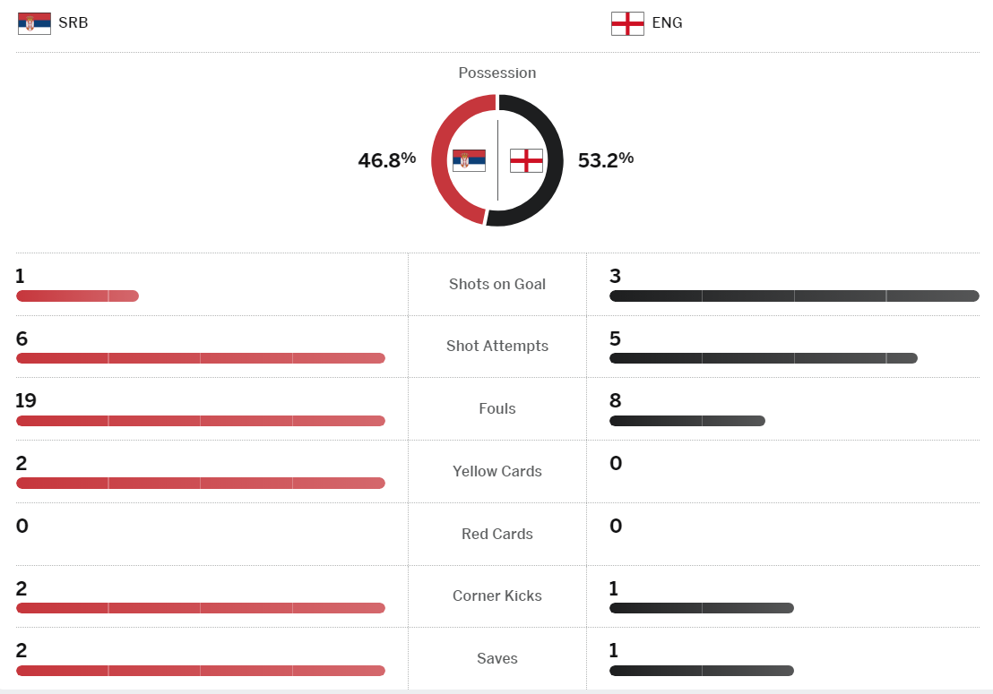 세르비아는 잉글랜드에 0:1 로 석패했는데, 전반 12분 벨링엄에게 선제골을 허용한 이후 좋은 수비를 보이면서 동점의 기회를 노리는 플레이를 했다. 미트로비치나 블라호비치 같은 공격수들에게 찬스가 만들어졌을 때, 굉장히 위협적인 찬스들이 만들어졌다. 특히 80분 이후 만들어냈던 찬스들은 잉글랜드의 수비력이 아니라면 해 볼만한 공격력이었다. 찬스에서 확실히 잉글랜드의 수비가 좋다는 느낌이었다.