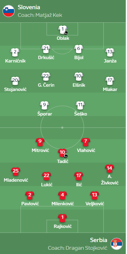 오늘의 공개된 라인업이다. 1라운드와 마찬가지로 슬로베니아는 4-4-2 전술을 사용할 것이며, 세르비아는 쓰리백의 3-4-3 으로 압박축구를 펼칠 것이다.