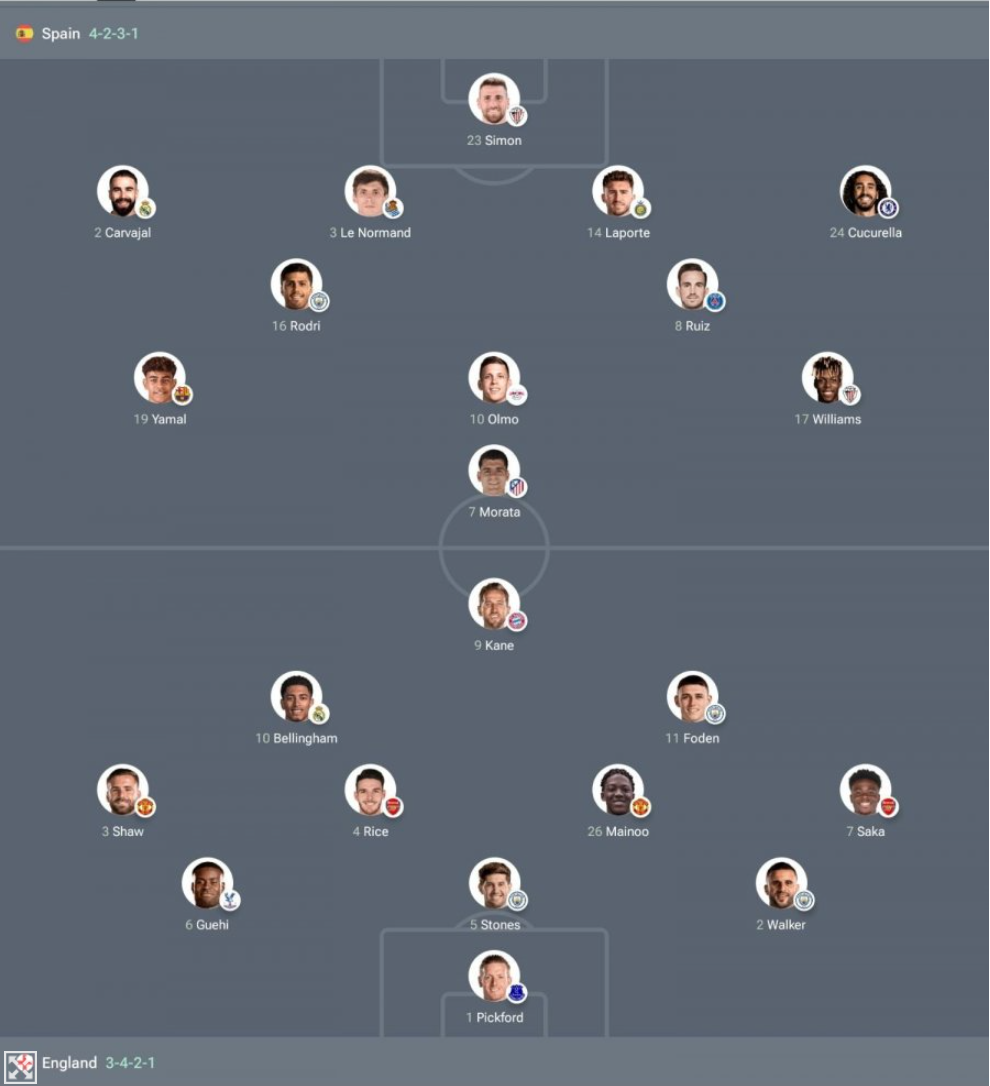4강에서 못 나왔던 르노르망과 카르바할이 돌아온 스페인이랄까. 페드리(바르셀로나)가 독일전에서 토니크로스의 거친 플레이에 시리즈아웃이 되었고, 그 역할을 다니올모 가 대신하고 있는 것 외에는 변화가 없다. 잉글랜드는 루크쇼가 뛸 수 있다면 약간의 상황 변화가 만들어질 수 있다.