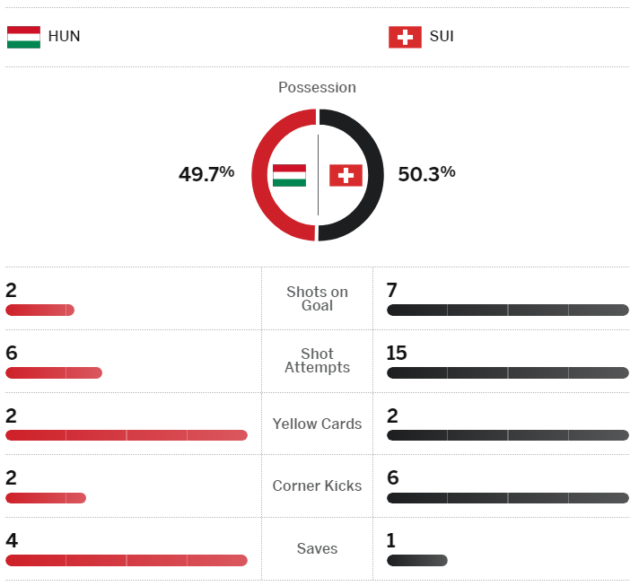 헝가리는 스위스 상대로 완벽하게 발렸다. 0-2 에서 추격골을 넣고 기적을 바랐으나 오히려 추가골을 내 주면서 무너졌다. 스탯 역시 스위스가 압도적이었다는 것을 보여주고 있다.