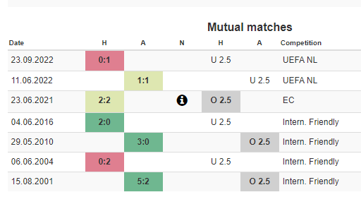 좌측이 독일, 우측이 헝가리인데, 독일은 상성에서는 헝가리를 압도하지 못했다. 2020년 이후 2무1패로 독일이 열세라는 점도 체크하자. 1라운드 결과, 그리고 독일이 홈이라는 걸 고려하면 독일이 압도적인 경기를 또 한 번 펼칠 수 있으나, 축구는 상대적이기 때문에 너무 단순하게 생각하고 싶지도 않다.