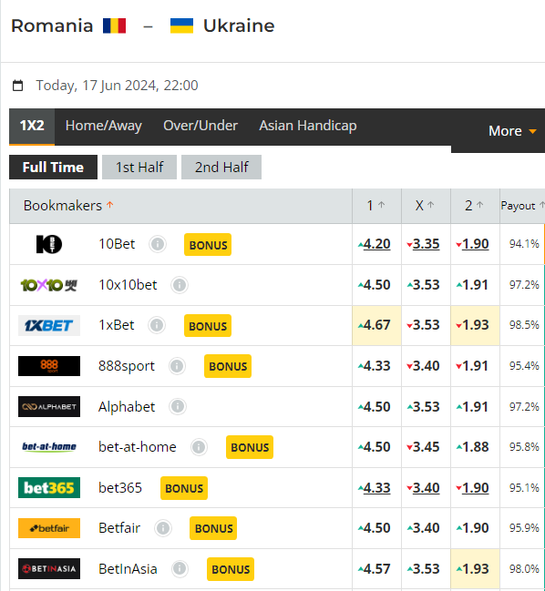 우크라이나 상대로 근소 열위일 수 있지만, 루마니아가 이기거나 비겨도 되는 +0.5 의 배당이 우크라이나 승리 배당보다 높거나 비슷한 것은 예측에 있어서 생각하게 만드는 부분이다. 선수 개개인의 이름값과 소속클럽이 배당에 영향을 준 것은 당연하기 때문에 무시할 것도 못 된다.