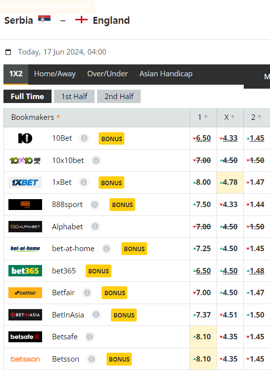 배당이 잉글랜드로 더 많이 방어되고 있으며, 아무튼 세르비아가 이기거나 비길 확률에 대해 오즈메이커들이 그리 높지 않게 판단하고 있다.