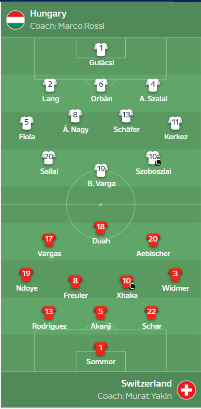 이탈리아 출신의 마르코 로시 감독이 3-4-3 을 내세웠고, 스위스가 수비축구를 펼치기 때문에 섯불리 나서다가 역습을 당할 것을 어느 정도 인지할 것으로 보인다. 특히 빗장수비로 유명한 이탈리아 출신 감독이기 때문에 수비 후 역습상황을 최소화시키려고 할 것이다. 소보슬러이(리버풀)의 부상 상태는 우려되었지만, 출전을 강행할 것으로 보인다.