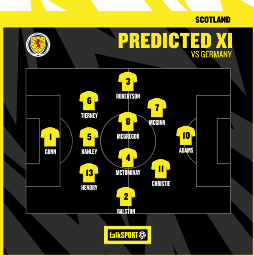 스코틀랜드는 압박형태의 3-4-3 을 사용할 것으로 보여지는데, 페터슨, 맥토미니의 부상으로 스쿼드 자체가 힘들어진 상황이다. 안 그래도 전력 자체가 약한데 더 약해져버린 모습이다. 수비후 역습보다는 전방압박을 시도하는 형태로 독일과 맞설 것으로 보인다., 완전 내려앉는다면 수비라인이 온전치 않기 때문에 더욱 위험해질 수 있다. 스페인, 노르웨이 등을 제압했을 정도로 응집력은 있는 팀인데, 핵심자원 둘이 빠진 핸디캡을 어떻게 극복할지..