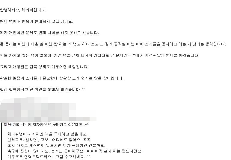 요즘 연재 작업을 준비함에 있어서 상당한 오해가 있는 것을 발견했습니다. 제가 책을 절판시키고 따로 판매한다는 오해입니다. 한 번도 그런 적이 없어서 너무 화가 납니다.