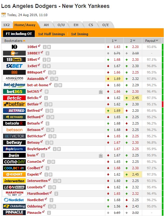 다저스로 기울고 있는 배당률입니다. 그것은 류현진의 방어율 (1.65) 을 고려하면 너무나 당연한 것입니다. 팩스턴이 좋은 투수이긴 하나 올해 못 던지고 있으니까요.그러나 5할 이상의 팀을 상대로 홈에서 29경기 24승5패를 하고 있는 다저스나 류현진의 홈 방어율 0.81 을 생각한다면 이 배당 역시 조금 높아 보이는 것이 사실입니다. 물론 불펜 등의 상황을 고려했겠지만, 묘하게 손이 가지는 않습니다.