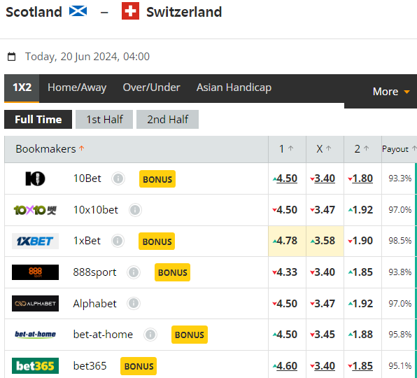 배당률은 스위스의 -0.5 / 스코틀랜드의 +0.5 로 동배당이 형성되어 있다.
