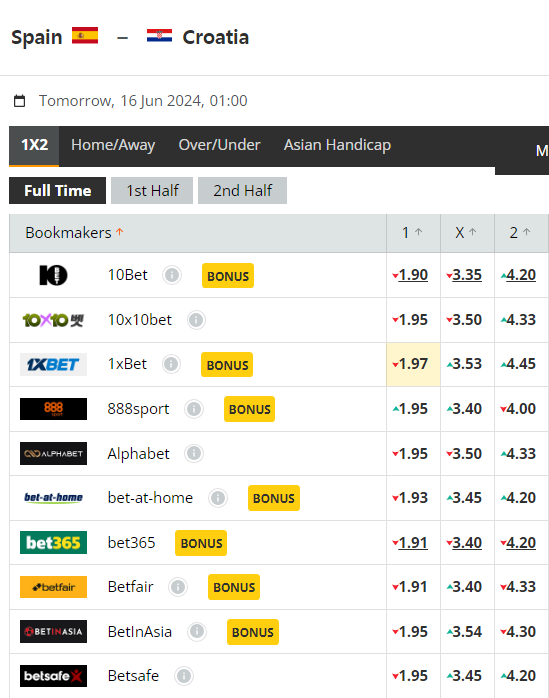 그런 의미에서 첫 경기인 스페인 vs 크로아티아 경기는 어떤 의미에서도 관전하고 싶은 경기이다. 배당은 다음과 같다.