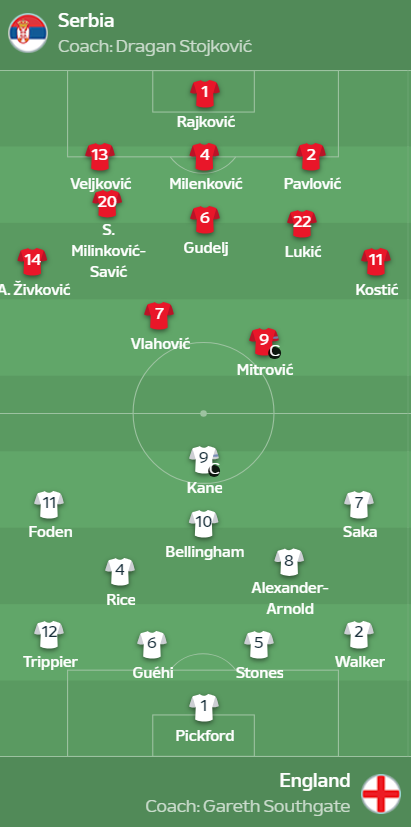 라인업은 세르비아가 3-5-2 를 사용하면서 미들의 압박을 강화할 것 같고, 잉글랜드는 수비적이지 않은 현대축구의 전형적인 포메이션인 4-2-3-1 을 구사할 것으로 보인다.