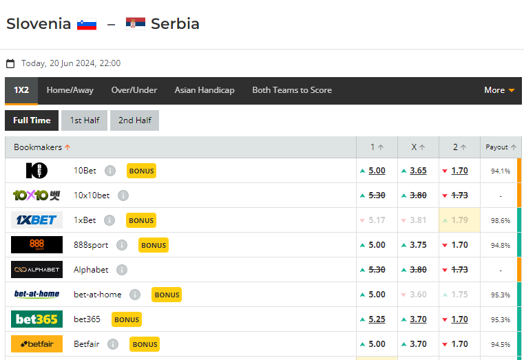 배당률은 세르비아의 승리가 슬로베니아 승무사이드에도 비해서 배당이 낮다. 경기는 뚜껑을 열어봐야 하지만, 오즈메이커들의 입장은 뚜렷하다. 슬로베니아가 이기거나 비기는 것보다 세르비아가 이기는 배당률이 더 낮은 것이다.