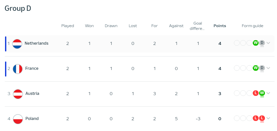 승점 3점을 확보한 오스트리아는 네덜란드와 달리 자력으로 1위가 불가능하다. 이기더라도 프랑스가 이기면 프랑스가 조1위가 된다. 1위를 하고 프랑스가 이기지 못하는 시나리오가 긍정적일 수 있다.