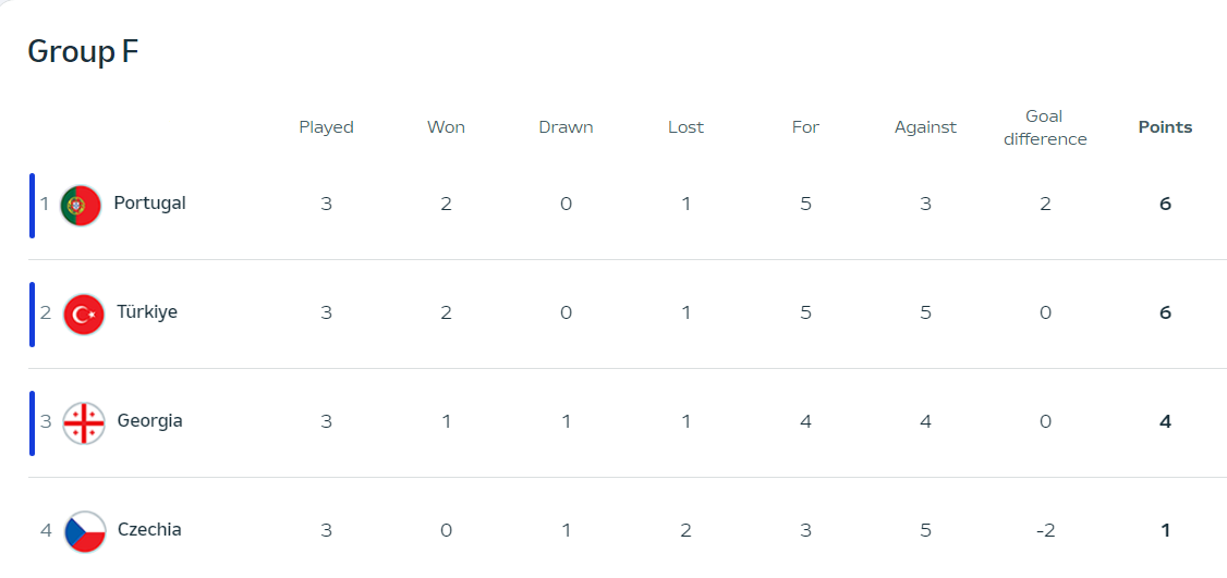 유럽, UEFA 주관대회는 골득실보다는 상대성(승자승)을 우선한다. 터키를 이미 이겼던 포르투갈이기 때문에 조지아에게 0:10 으로 진다고 해도 1위로 올라갔다. 그것을 고려해서 오픈게임까지 생각했는데 0:2 로 패했다. 괘씸했다. 포르투갈은 여러가지 전술시험을 했다는 판단이다.