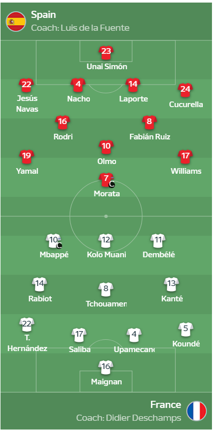 Spain: Unai Simón: Navas, Nacho, Laporte, Cucurella; Olmo, Rodri, Fabián Ruiz; Lamine Yamal, Morata, Williams
